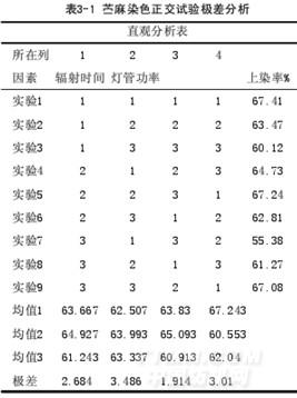 由上表可见,因素对试验指标影响的主次顺序(由主到次)为:B,D,A,C,极差最大值(C 5.153)产生于B因素,所以影响上染率的主要因素为灯管功率B。