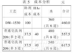 如表5的分析可以看出,相对普通皂洗剂209而言,酸性皂洗剂DM-1530的综合成本优势较大,可以节约能源成本20%~30%,同时由于减少了水洗道数,节约了时间,从而提高了生产效率。