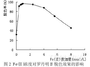 在初始[罗丹明B]=50mg/L,[K2S2O8]=3mmol/L 的条件下,改变Fe(Ⅱ)的初始浓度,反应时间为2h,罗丹明B 脱色效果如图2 所示。由图可以看出,随着Fe(Ⅱ)投加量的增加,罗丹明B 的脱色率先增大然后不断降低。这主要是因为,Fe(Ⅱ)的存在可以催化过硫酸钾形成自由基,参与罗丹明B 的氧化反应,但当Fe(Ⅱ)浓度超过一定量时,过量的Fe(Ⅱ)会消耗一部分过硫酸钾,使用于染料氧化分解的过硫酸钾量减少。从图2 中可以看出,Fe(Ⅱ)加入量以1.0mmol/L 左右比较合适。同时,加入Fe(Ⅱ)后,罗丹明B 的去除速率明显增大,在Fe(Ⅱ)加入量在1.0mmol/L 左右时,脱色速率约为不加Fe(Ⅱ)时的3-4 倍。