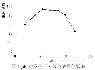 pH 值影响着反应体系中自由基的生成和脱色效率。因为,对于过硫酸根,在不同的pH 值条件下,生成的自由基不同,其氧化能力也不同;一般酸性条件下,过硫酸根反应产生更多的硫酸根自由基;在碱性条件下,硫酸根自由基则更易于向羟基自由基转化,从而产生了更多的羟基自由基。试验中,先将溶液调节成不同的pH 值后,加入过硫酸钾和Fe(Ⅱ)以观察不同的初始pH 值对罗丹明B 脱色效果的影响。在初始[罗丹明B]=50mg/L,[K2S2O8]=3mmol/L,[FeSO4]=1mmol/L 的条件下,改变初始pH 值后加入氧化剂,反应时间为2h,罗丹明B 脱色效果如图3 所示。从图中可以看出,罗丹明B 的分解脱色速率受pH 的变化的影响,pH 值较低和较高都不利于罗丹明B 的脱色效果,而在反应体系为中性左右脱色效果较好,尤以微偏酸(pH=5 左右)条件下最好,罗丹明B 脱色率达到90%以上。