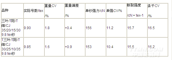 该系列纱线产品质量除纤维含量未检测外,其余技术指标均达到GB/T 398—1993《棉本色纱线》国家标准一等品以上要求。