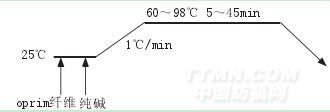 本试验时,在染色试样机中放置9个染杯同时染色,按相同的皂洗工艺配方(碱浓度2g/L),在每个染杯加入同缸染色后的色毛10g,加温至60℃下保温20min,取一个染杯中色毛做卷曲率测试,其它8个染杯继续加热升温,分别达到为60℃、70℃、75℃、80℃、85℃、90℃、95℃和98℃时,都保温20min后,各取一个染杯中的色毛,做卷曲率项目的测试。