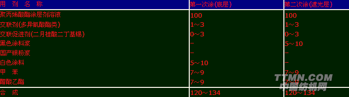⑵ 工艺流程和条件:半制品→预处理→底涂→烘干→第二次涂遮光层→烘干→第三次涂表层→烘干 工艺条件:预处理,预防水(处方同前),烘干或平轧光。 涂层: 底涂:用浮刀法锐角刮刀。 第二次遮光层:用浮刀法圆形刮刀,必要时可重复一次。 第三次表层:用浮刀法锐角刮刀。 烘干:90~100℃。