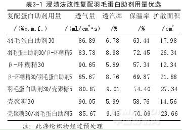 从表3-1可以看出,羽毛蛋白助剂与壳聚糖复配为30/5(%,o.m.f.)时,涤纶织物的透气率、保温率最好,扩散面积最大,透气量比较小。这是因为壳聚糖与羽毛蛋白助剂之间存在着较强的氢键作用,两者基本相容。壳聚糖分子中含有羟基,乙酰氨基和氨基等活泼基团,有很好的生物相容性,将复配羽毛蛋白助剂在涤纶织物表面形成一层不完整的膜,使得涤纶织物的透气性能下降不大。所以,将壳聚糖处理到涤纶织物上,使织物的舒适性能提高。β-环糊精也是亲水性高分子物质,但它与羽毛蛋白助剂的相容性不好,研究中发现,β-环糊精和羽毛蛋白同时处理织物会产生絮凝状物质,影响织物的舒适性能,所以选取复配蛋白助剂用量为:羽毛蛋白助剂与壳聚糖复配为30/5(%,o.m.f.)。