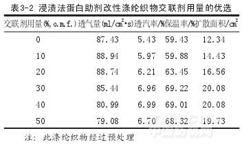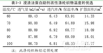 (3)浸渍法改性涤纶织物温度的优选按照1.2.3(1)工艺方法,涤纶织物用30%(o.m.f.)羽毛蛋白助剂和壳聚糖5%(o.m.f.)共同处理后,再加入30%(o.m.f.)的交联剂EH,在60~100℃的条件下再处理30min。并测试织物的舒适性能。结果如表3-3。