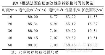 (4)浸渍法改性涤纶织物时间的优选按照1.2.3(1)工艺方法,涤纶织物用30%(o.m.f.)鸡毛蛋白助剂和壳聚糖5%(o.m.f.)共同处理,再加入30%(o.m.f.)的交联剂EH,在80℃的条件下再处理10~50min。并测试织物的舒适性能。结果如表3-4。