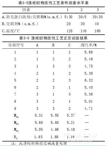 本试验用浸渍与浸轧联合的工艺方法来对涤纶织物改性,通过对涤纶织物舒适性能的测定来优化工艺过程。按照1.2.3(2)工艺方法,2.2测量涤纶织物的透气性能。如表3-5和3-6。
