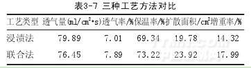 从表3-7可看出,联合改性的工艺中织物扩散面积、透气率、保温率有所提高,透气量减小这是因为羽毛蛋白助剂缺乏反应性基团,与涤纶织物结合不牢固,除了有必要的高反应性交联剂外,还需要选择合适的改性工艺方法及条件,浸渍改性后的织物再进行高温焙烘,使纤维分子链运动加剧,纤维分子中内应力降低,结晶度和晶区有所增大,非晶区趋向集中,将羽毛蛋白助剂,交联剂与纤维结合的更加紧密,更加牢固,纤维表面亲水性基团增多,复配羽毛蛋白处理到织物上,在织物表面形成一层不完整的亲水性膜,导致透气量有少量降低,涤纶织物舒适性能有所提高。所以选择浸渍与浸轧联合的改性方法处理涤纶织物。