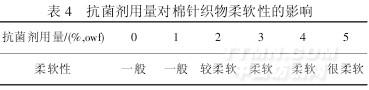 由表4可以看出,织物的柔软性随着抗菌剂用量的增加逐渐变好,原因是抗菌剂中含有有机硅成分,而有机硅是很好的纺织品柔软剂材料.综合考虑,确定抗菌剂用量为4%(owf).