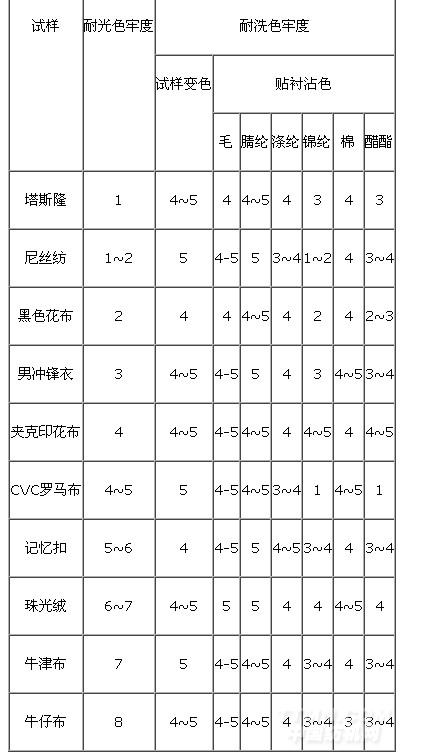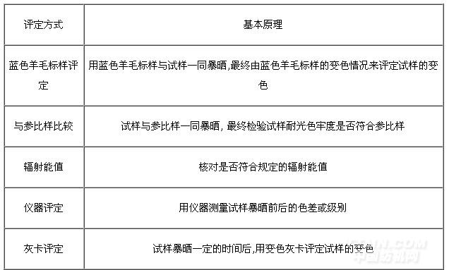 从表1可以看出,耐光色牢度的评定方式多种多样,差别很大,所测结果也各不相同。在这些评定方式中,常用的是利用蓝色羊毛标样的变色情况确定试样的变色;变色灰卡评定方法在国家标准和国际标准中,只是简单提及,没有规定具体的检测评定方法,一般只是试样在暴晒规定的时间后,用变色灰卡评定试样的变色级别;仪器评级是参照变色灰卡,通过仪器把试样暴晒前后的色差转换成级别,所评结果与变色灰卡保持一致;其它两种评定方式较少采用,只在局部范围内使用。