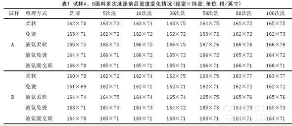 通过表1可看出,与其它整理方式相比,柔软整理牛津纺面料的定型性较差,随水洗次数的增加,经纬向逐渐收缩,密度增加。100次洗后经密分别比洗前增加3根,即纬向平均收缩2%。两面料纬密分别增加5根和7根,平均经向收缩达7%。