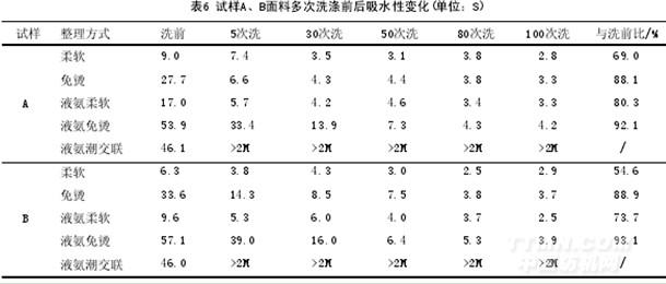 由表6看出,除潮交联整理面料外,其它整理方式的面料随着洗涤次数的增加,水滴渗透扩散时间逐渐缩短,面料吸水性逐渐增强。