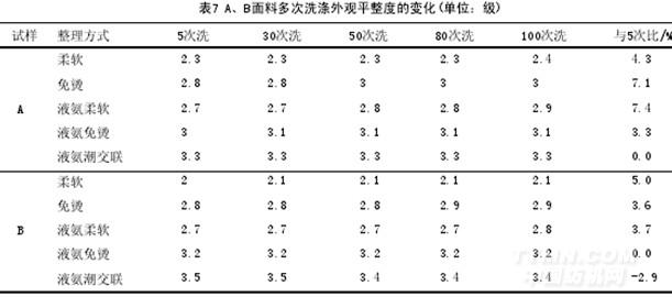 随着洗涤次数的增加,柔软、液氨柔软、免烫面料洗后外观平整度有所改善,主要原因是洗涤多次后纤维蓬松,纱线柔韧性增加。