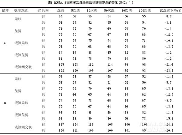 表7 A、B面料多次洗涤外观平整度的变化(单位:级)由表7看出,面料经免烫整理或液氨整理后外观平整度增加半级,液氨免烫整理增加近1级,液氨潮交联后免烫性增加1级以上。通过折皱回复角检测(见表8)也可看出面料经过免烫或潮交联整理后抗皱性明显增加。