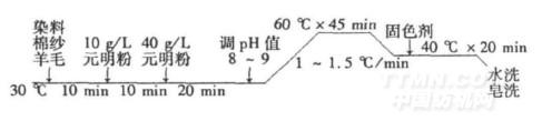取一定量的原棉纱线和羊毛散纤维,同浴精练和漂白后,采用ANOZOL活性染料一浴一步法染色。
