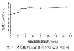 图1中,精练酶质量浓度由1g/L提高至5g/L,纱线的毛效值显著增大;当质量浓度超过5g/L后,纱线的毛效趋于稳定。因此,取精练酶用量以5g/L为宜。