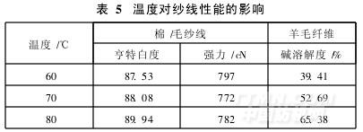 分别于60、70、80℃的温度下对棉/毛纱线和羊毛纤维漂白,测试漂后纱线的白度、强力和羊毛的碱溶解度,结果如表5所示。