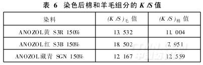 本试验采用ANOZOL常规活性染料三原色黄S3R150%、红S3B150%和藏青SGN150%,对按优化的酶精练-氧漂工艺(煮练酶5g/L,pH值7,渗透剂JFC3g/L,55℃精练50min;双氧水20g/L,pH值10,60℃漂白90min)处理的棉、毛散纤维进行同浴染色,染色结果如表6所示。