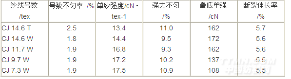 日本丰田公司推荐的喷气织机入纬率在1500 m/min时纯棉经纬纱的最低质量要求如表1所示,可供参考。