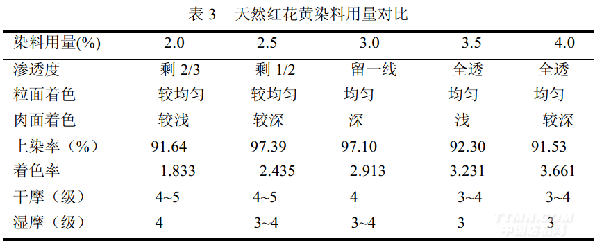 从表2和表3可以看出:单独使用时,随着染料用量的增加,两种天然染料的上染率均先上升后逐渐下降,而着色率均逐渐提高。染料用量少时,其粒面及肉面着色程度反而深,原因可能是当用量太少时,只能吸附在皮的表面,难以渗透到内部。因此可以认为3.5%、7.0%分别是天然红花黄和栀子黄染料染色的饱和用量。另外还可以看出,天然红花黄染料的干、湿摩擦色牢度较好,而天然栀子黄则一般,但是对于皮革来说后期还要进行适当的涂饰整理,3级左右的摩擦牢度还可以接受。