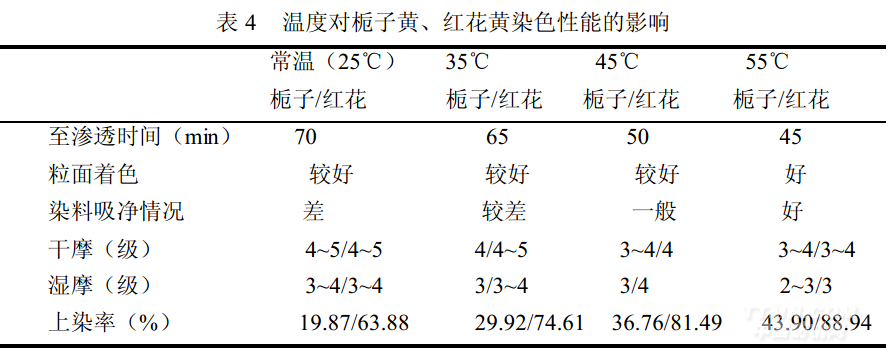 表4中单独用栀子黄和红花黄的染料用量分别为7.0%、3.5%。温度对于染料影响较为复杂,高温可以促进染料的溶解和分散,减少染料的聚集,使分子运动加快,提高染料的渗透性能和上染率,但是高温也会引起革粒面粗糙,甚至出现局部收缩,根据表4的试验结果,天然栀子黄和红花黄的染色温度选在50~55℃为宜。