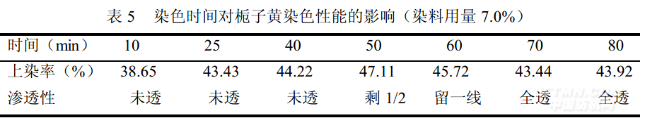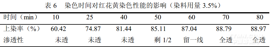 试验中同时选择厚度、大小、部位相近、中和深透的铬复鞣皮8块进行染色,每隔一定时间做皮革切口渗透性和染料上染率的测定,得到如表5、表6结果,可以看出随着染色时间的延长,两种染料的上染率提高。当染色时间为70min时,皮染透,上染率接近最大,染色基本达到平衡,即使再延长时间,上染率提高不大。因此染色时间控制在70min为宜。