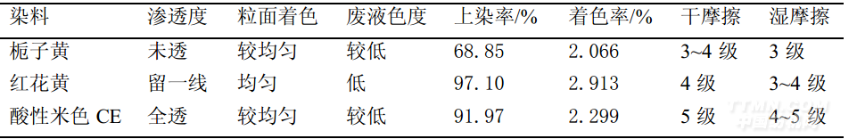 着色也令人满意,渗透性稍差,摩擦色牢度低1级可能与样品得色有关,天然栀子黄的各项