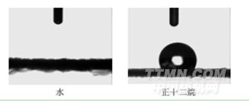 从图2可以看出,水对整理后织物完全润湿,接触角为0°;正十二烷在织物上接触角较大,为116.3°.说明Pf在织物上形成的涂层具有亲水拒油性.
