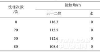 由表1可知,洗涤80次后,整理棉织物与正十二烷的接触角为108.4°,与水的接触角仍为0°,表现出很好的亲水性.说明棉织物的亲水拒油性具有很好的耐洗性,所合成的含氟整理剂稳定性很好.