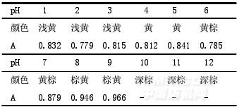 茶叶色素随pH的不同,其颜色会发生不同变化,当pH<5时,色素溶液为浅黄色;当pH=6、7时,色素溶液为黄棕色;pH>8时,色素溶液近深棕色,茶叶特征颜色基本消失。其吸光度随着pH的增加而呈波动态,说明溶液的pH对色素稳定性影响非常明显,可能是由于色素的分子结构发生了转变。为了使色素溶液保持正常的颜色,溶液的pH应维持在近中性偏弱酸条件下。