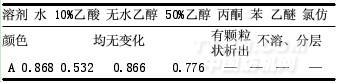 常温条件下,将色素浓缩液分别用水、10%乙酸、无水乙醇、50%乙醇、丙酮、苯、乙醚、氯仿按照1:1(体积比)稀释进行溶解性试验(10%乙酸按1:2进行),如表3。