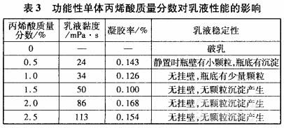 试验发现,反应体系中不加功能性单体AA时,乳液在聚合过程中稳定性较差,聚合速率较快,出现较多的凝聚物。AA是一种亲水性单体,既可溶于水相又可溶于油相,加人后参与共聚,可以使竞聚率相差较大的单体共聚反应容易进行。AA的加入有利于提高乳液合成的稳定性,因为AA分子中的羧基(一C00H)是强极性基团(带负电荷),可以使乳胶粒外层带有静电荷。因此,乳胶粒间因静电相斥而不易聚集在一起,从而提高了乳液的稳定性。由于羧基大部分分布在乳胶粒表面,使得乳胶粒与水分子问形成大量的氢键,分子间作用力加强,乳液黏度增加。为了进一步提高最终产品的稳定性,通常使用NH,H0将乳液体系的pH值调至7~8。功能性单体AA质量分数对乳液性能的影响见表3。