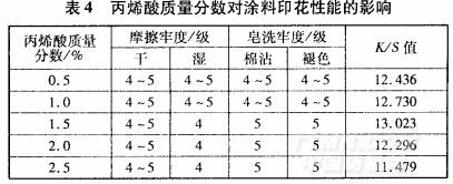 表4中,不加或加人少量丙烯酸,用此黏合剂调制的印花糊出现破乳堵网,织物印花轮廓不清晰;而丙烯酸质量分数过高,成膜性能变差,膜的亲水性增加,湿态强度下降,影响湿摩擦牢度性能。
