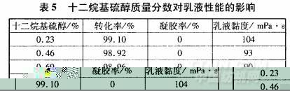采用十二烷基硫醇(DDM)为链转移剂,可使聚合物的相对分子质量降低,以有效控制聚合物相对分子质量,对聚合速率则影响不大。本试验将十二烷基硫醇和丙烯酸酯类单体一起加入进行乳化。十二烷基硫醇质量分数对乳液性能的影响见表5。