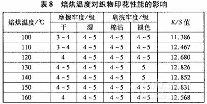 从表8看出,焙烘温度在1300C时,印花织物的干/湿摩擦牢度和皂洗牢度都很高;K/S值在140℃达到最大值12.852,温度再提高,印花织物的表观颜色深度的变化不大。考虑到温度升高会使织物手感变差,且易发生高温脆损,浪费能源,取焙烘温度为130℃。