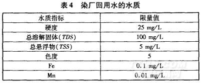 染厂产生的废水进行一定的处理后可回用于生产,从而无需排放到江河中。表4列示了可回用水的水质要求。回用水的浊度和色度必须低;硬度也要控制好,以免沉积在织物上;某些化学品的浓度也不能超过限量值。例如,由于铁盐会使白色织物泛黄,并能催化漂白剂分解,因而其质量浓度不能超过0.1mg/kg。此外,在染色过程中,铁还能与某些染料形成络合物,而使染色物色泽暗淡。实际生产中,每个工厂、每种织物对水质的要求也各不相同。