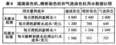 以日产量为4o吨的棉染色工厂为例,分析了采用的染色机和废水回用对环境和经济成本的影响。采用三种染色设备——溢流染色机、喷射染色机和气流染色机。表5是工厂的一些运行数据。溢流染色机、喷射染色机和气流染色机的染色浴比分别是1:10,1:5和1:4。每千克棉在这三种染色机中进行前处理、染色和后处理的用水量分别是100,60和5OL。