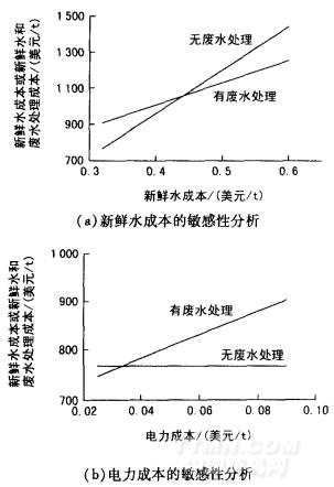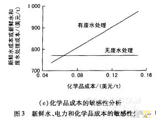 表6是采用3种染色设备的用水数据。溢流染色机每天需要4000t新鲜水,远高于喷射染色机(2400t)和气流染色机(2000t)。Kazakevieiute等对喷射染色机和气流染色机的水、热能和化学品的消耗量进行分析比较,也发现后者的消耗量更少。如果采用此废水处理厂,那么48%的水可回用于染色工艺。对于溢流染色机、喷射染色机和气流染色机而言,每天新鲜水的消耗量可分别减少到2080,l248和1040t。假设每吨水的价格是0.32美元,那么采用这3种设备时新鲜水和废水处理的总成本分别是每天1506,903和753美元。图3(a)的敏感性分析(译注:敏感性分析法是指从众多不确定性因素中找出对投资项目经济效益指标有重要影响的敏感性因素,并分析、测算其对项目经济效益指标的影响程度和敏感性程度,进而判断项目承受风险能力的一种不确定性分析方法)表明,一旦新鲜水的价格超过0.44美元/吨,工艺用水的回用将会更加经济。这一结论表明,对于印染厂,工艺用水回用带来的经济性是非常吸引人的。图3(b)和图3(c)的电力(0.03美吨)和化学品(0.06美元/吨)成本数据也显示了相似的结论。