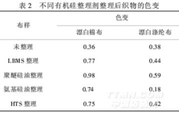 根据CIE1976L*、a*、b*总色差值与牢度级别的关系可知,△E≤0.2,色差为5级,△E≤0.8,色差为4~5级.从表2可以看出,氨基硅油整理后的织物色变最小;聚醚硅油整理后织物的色变最大;而LBMS、HTS整理后织物的色变较小.产生色变的原因比较复杂,除了人们普遍认为的氨基被氧化变色外,染料被氧化、乳化剂的增溶效应及高温时纤维结构被破坏等也是产生色变的重要原因.染色织物在高温定形时,染料分子活动加剧,部分结合不牢固的染料会脱离纤维热迁移或升华,染料在向外层(包括织物表面和空气中)扩散时若没有受到阻碍,织物最后的色泽将主要体现为表层染料的色光;若受到阻碍(硅油成膜),发生热迁移的染料将在织物表面聚集,最后的色泽较为复杂,一方面表面染料浓度增加,另一方面硅油膜改变了光线的折射率,加上氨基在高温情况下被氧化等,使织物的颜色变深变暗.[7]由于氨基硅油覆盖在纤维表面并形成一层疏水性的薄膜,防止染料与溶液接触而溶解,有一定固色作用,减少了染料的脱落,起到了减少色变的效果.