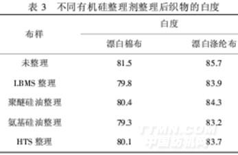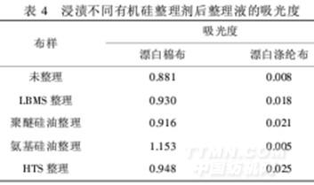 从表3可以看出,整理后织物白度都有一定程度的降低.聚醚硅油不含有氨基,不存在氨基被氧化而产生发色基团,其白度下降最小;氨基硅油则与之相反,其白度下降较大;LBMS和HTS采用了特殊的结构设计,其酰胺基或季铵盐基具有较强的抗氧化能力,经整理的织物抗黄变性强,白度下降较小.