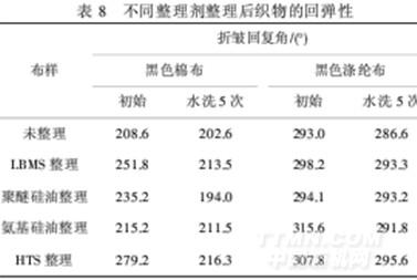 从表8可以看出,经整理剂整理的织物跟原样相比回弹性能有所提高,水洗后织物跟初始织物相比回弹性能有所下降.经整理剂整理后织物的纤维与整理剂间发生部分化学交联,起到固定纤维位置的作用,从而提高了回弹性能.