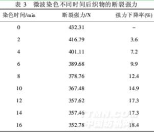 (2)与常规染色法相比,微波染色更节省时间和能源,且染色牢度和透染性与常规染色相似.微波会使织物的强力稍有下降.
