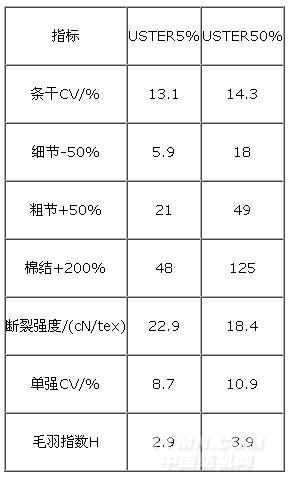 为了保证产品质量,从天丝原料的入厂检验、纺纱、织造等整个生产过程,我们都制定了专门的生产作业计划书,确立了在线监测和半成品、成品周期试验项目控制点。特别是对天丝原料的检验,由于暂时没有国家标准,甚至没有行业标准,我们暂时参照GB/T 14463 2008粘胶短纤维国家标准执行。天丝纱线质量指标参照USTER2001,100%粘胶纱(环锭纺),成纱统计指标,如表2。
