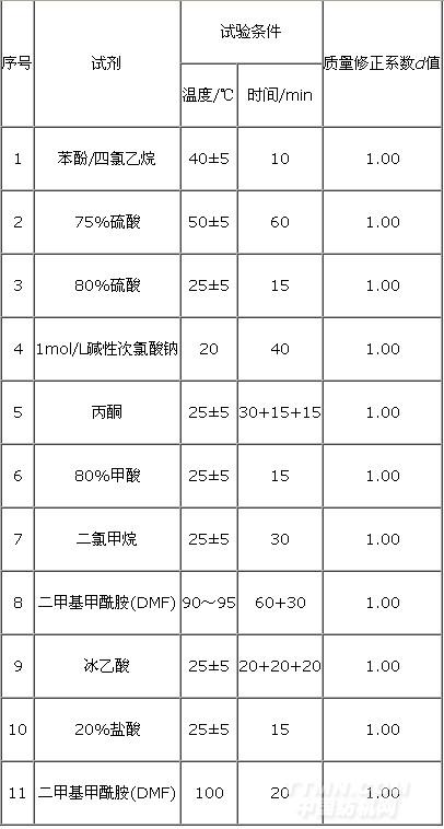 从表1可以得知,聚苯硫醚纤维在以上试剂中稳定性良好,质量修正系数均为1.00,可用于聚苯硫醚纤维与其它纤维混纺产品二组分和三组分纤维含量分析。