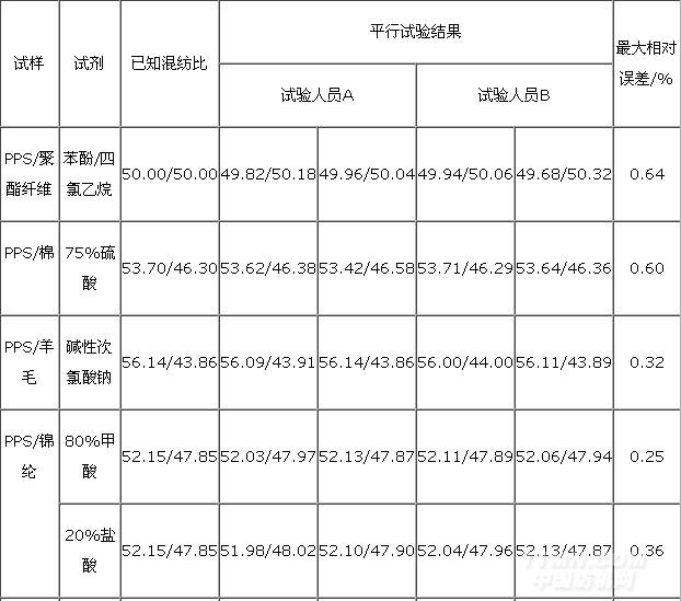 根据上述各试验方法进行验证试验。取已知重量百分比的聚苯硫醚纤维与其它纤维混合物进行试验。参照GB/T2910—2009 《纺织品定量化学分析》,由于纤维素纤维(棉、苎麻、亚麻、大麻、罗布麻、剑麻、黄麻、粘纤、莱赛尔纤维、莫代尔纤维、铜氨纤维等)在75%硫酸中可以完全溶解,化学性质相似,选取棉纤维作为代表进行试验;同理,蛋白纤维(羊毛、兔毛、驼毛、马海毛、蚕丝、其它动物纤维)选取羊毛纤维作为代表进行试验。每种样品均由两名试验人员分别进行平行试验,以进一步确定试验结果的准确性和稳定性。验证试验结果见表2。