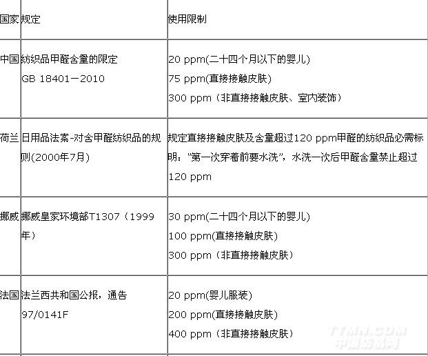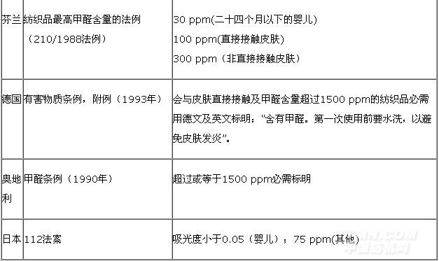 自20世纪80年代以来,世界主要国家纷纷出台相关的法规或强制标准,对产品的游离甲醛含量作了严格的限定(见表1)。