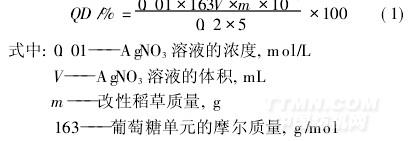 取0. 2 g按1. 2节方法配制的稻草秸秆季铵盐,用100 mL去离子水溶解,搅拌均匀;以0. 01 mol/L AgNO3溶液通过电位滴定法测Cl-浓度,其季铵化度(QD)按式(1)计算: