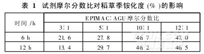 由2. 1. 1节试验结果可知,虽然反应时间为12 h时季铵化度最高,达27. 5%,但较反应时间6 h的季铵化度(26. 7% )仅提高了0. 8%。所以,当稻草质量5. 0 g,NaOH质量分数3%,反应时间为6 h和12 h,温度为85℃时,分别讨论反应试剂EPTMAC∶AGU摩尔分数比对稻草季铵化度的影响,结果见表1。