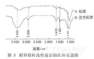 由图3可知,稻草改性处理前后在1 636 cm-1处均有吸收峰,此处为葡萄糖单元AGU的伸缩振动;改性稻草在1 481 cm-1处出现新的吸收峰,此吸收峰为季铵盐上的—CH3[2];在2 908 cm-1处的吸收峰代表稻草中脂肪链上的C—H键[12]; 1 110 cm-1处的吸收峰为C—O键的伸缩振动。通过对比分析可知,稻草秸秆中引入了季铵盐基团。