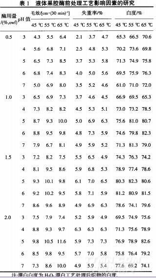 液体果胶酶前处理工艺影响因素的研究见表1.